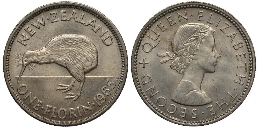 Новая Зеландия 1 флорин 1965 Елизавета II (1952-2022), птичка киви KM 28.2 медно-никель UNC 36-631