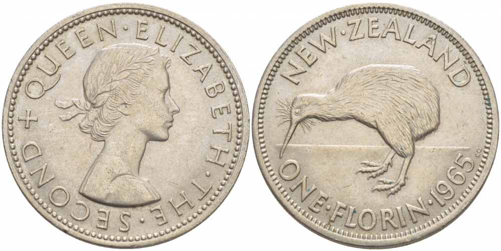 Новая Зеландия 1 флорин 1965 Елизавета II (1952-2022), птичка киви KM 28.2 медно-никель UNC 51-133