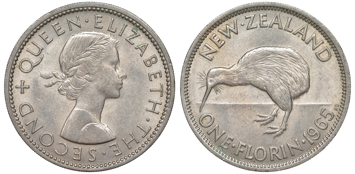 Новая Зеландия 1 флорин 1965 Елизавета II (1952-2022), птичка киви KM 28.2 медно-никель XF-UNC 51-612