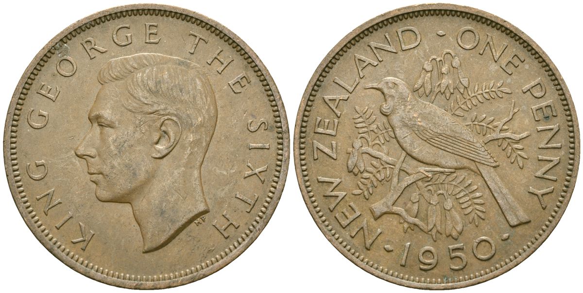 Новая Зеландия 1 пенни 1950 Георг VI (1936-1952), новозеландский туи KM 21 бронза 4536-116