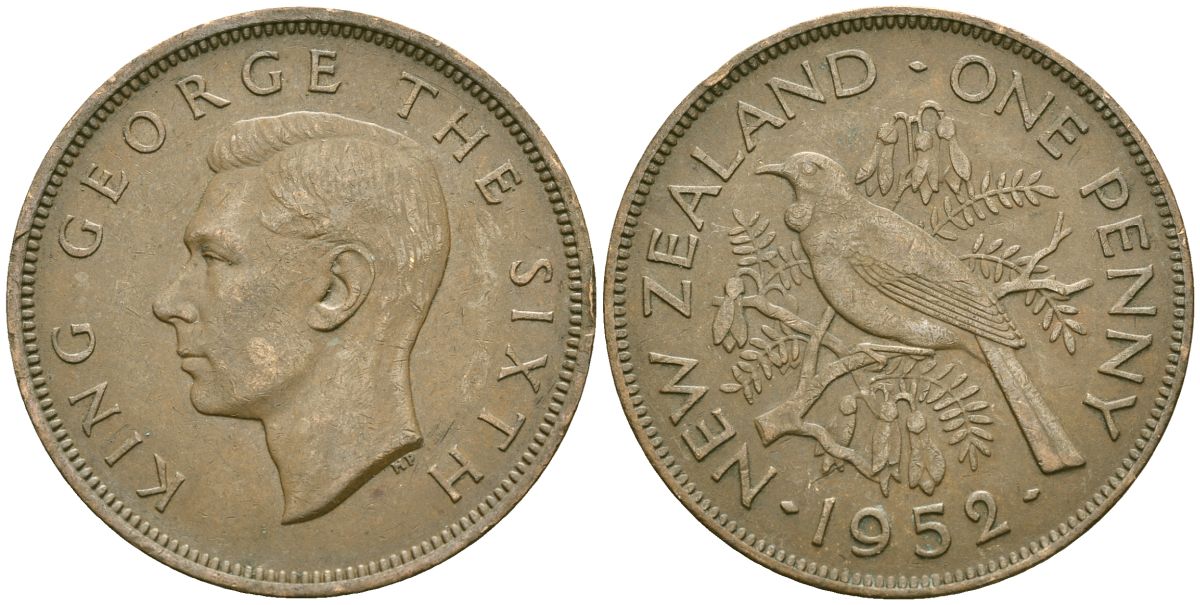 Новая Зеландия 1 пенни 1952 Георг VI (1936-1952), новозеландский туи KM 21 бронза 3457-435