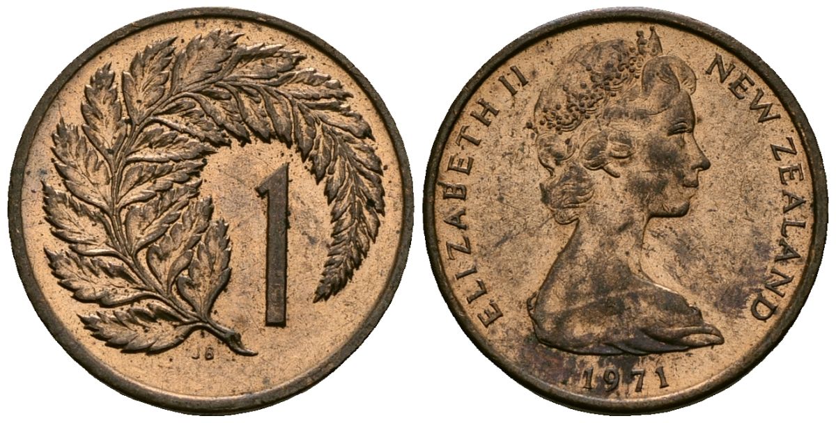Новая Зеландия 1 цент 1971 Елизавета II (1952-2022), лист папоротника KM 31.1 бронза 4173-943