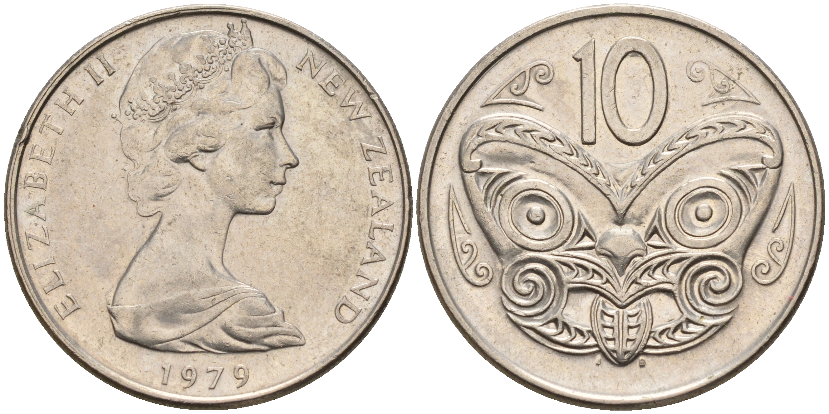 Новая Зеландия 10 центов 1979 Елизавета II (1952-2022), маска маори KM 41.1 медно-никель 4603-255