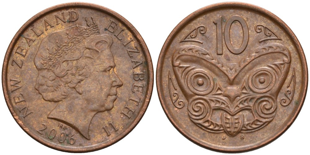 Новая Зеландия 10 центов 2006 маска Маори, Елизавета II (1952-) KM 117а сталь плакированная медью 119-955