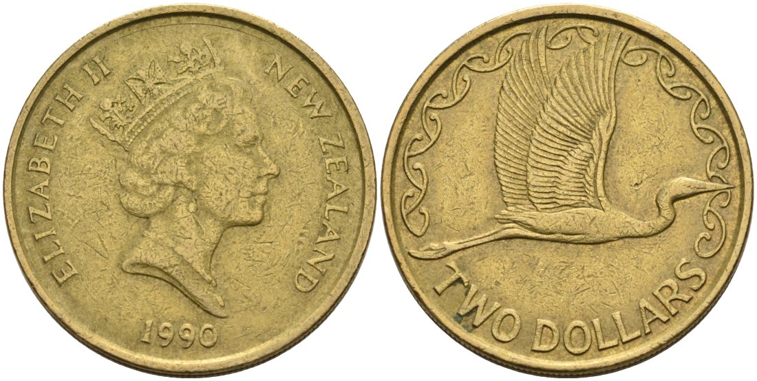 НОВАЯ ЗЕЛАНДИЯ 2 доллара 1990 Елизавета II (1952-2022), большая белая цапля KM 79 алюминиевая бронза 59-111