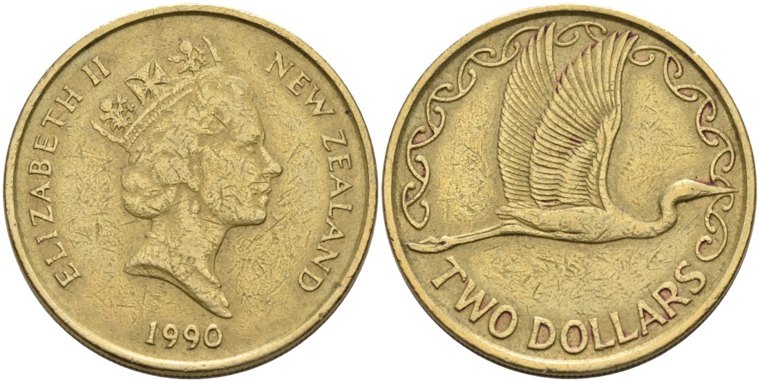 НОВАЯ ЗЕЛАНДИЯ 2 доллара 1990 Елизавета II (1952-2022), большая белая цапля KM 79 алюминиевая бронза 59-215