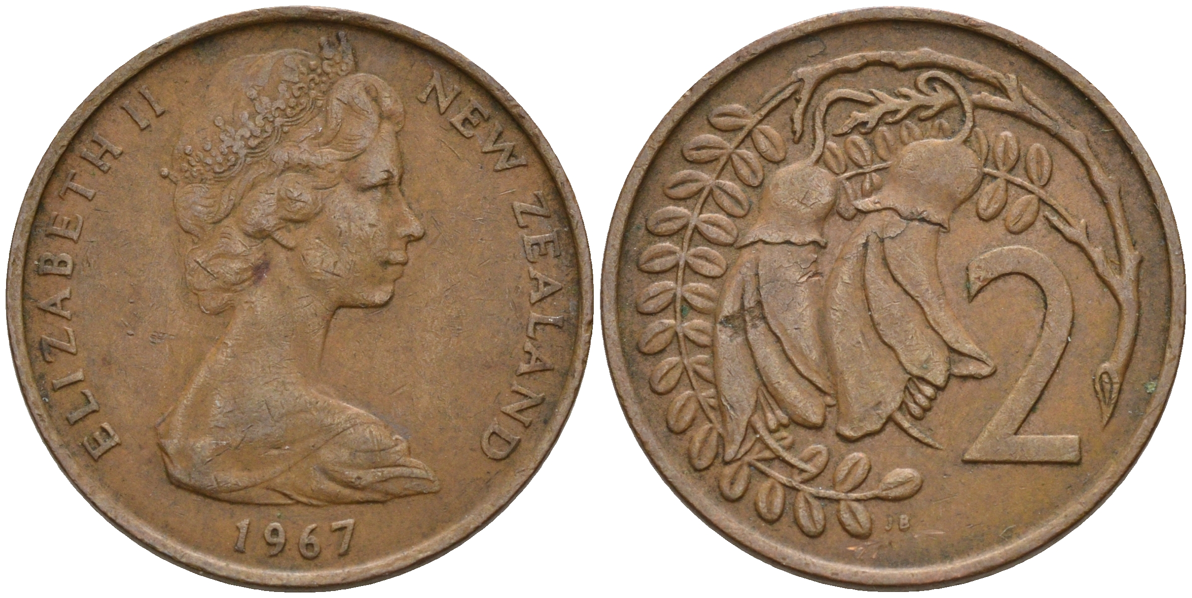 Новая Зеландия 2 цента 1967 Елизавета II (1952-2022), два цветка кохаи KM 32.1 бронза 4602-641