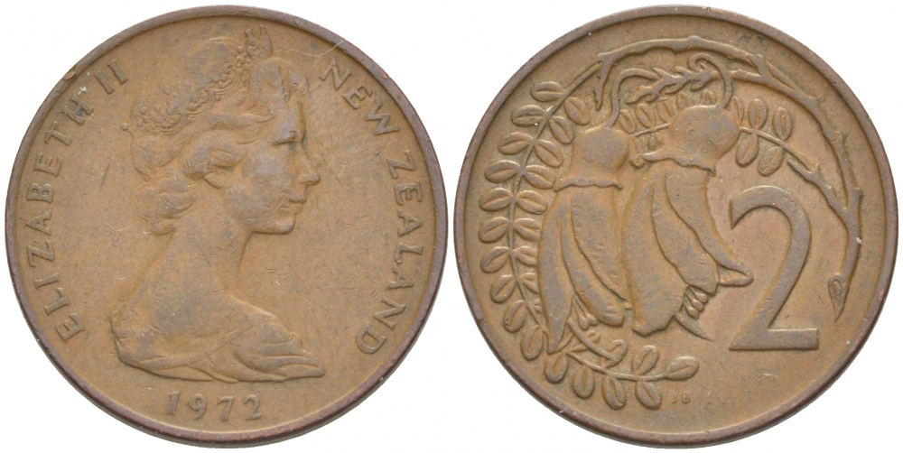 Новая Зеландия 2 цента 1972 Елизавета II (1952-2022), два цветка кохаи KM 32.1 бронза 214-839