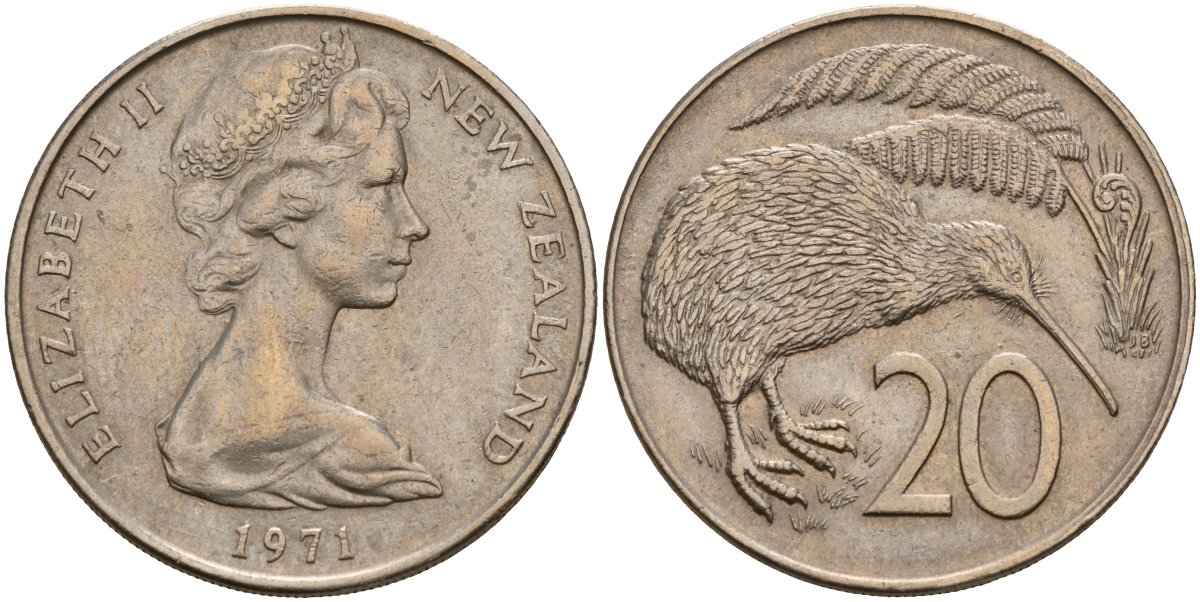 Новая Зеландия 20 центов 1971 Елизавета II (1952-2022), птичка киви KM 36.1 медно-никель 189-211