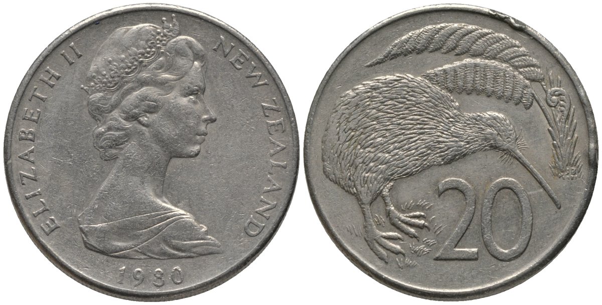 Новая Зеландия 20 центов 1980 Елизавета II (1952-2022), птичка киви KM 36.1 медно-никель 81-622