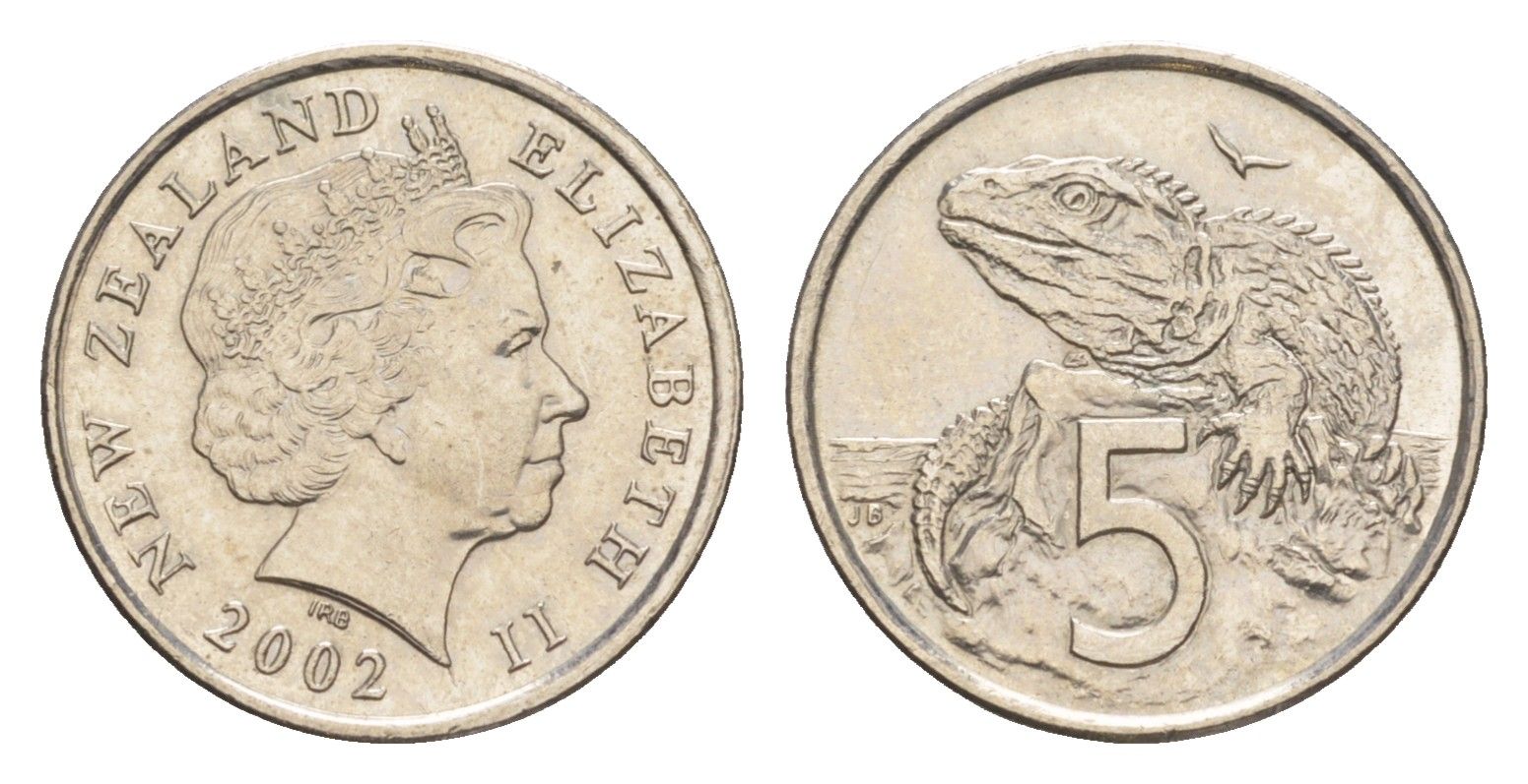 Новая Зеландия 5 центов 2002 Елизавета II (1952-2022), ящерица гаттерия KM 116 медно-никель UNC 4651-229