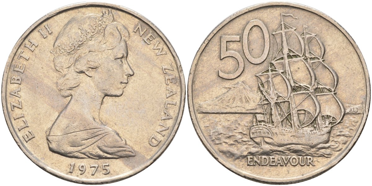 Новая Зеландия 50 центов 1975 Елизавета II (1952-), парусник Индевор KM 37.1 медно-никель 4131-1216
