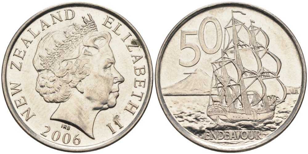 Новая Зеландия 50 центов 2006 Парусник Индевор, Елизавета II (1952-) KM 119а никелированная сталь 4579-1041