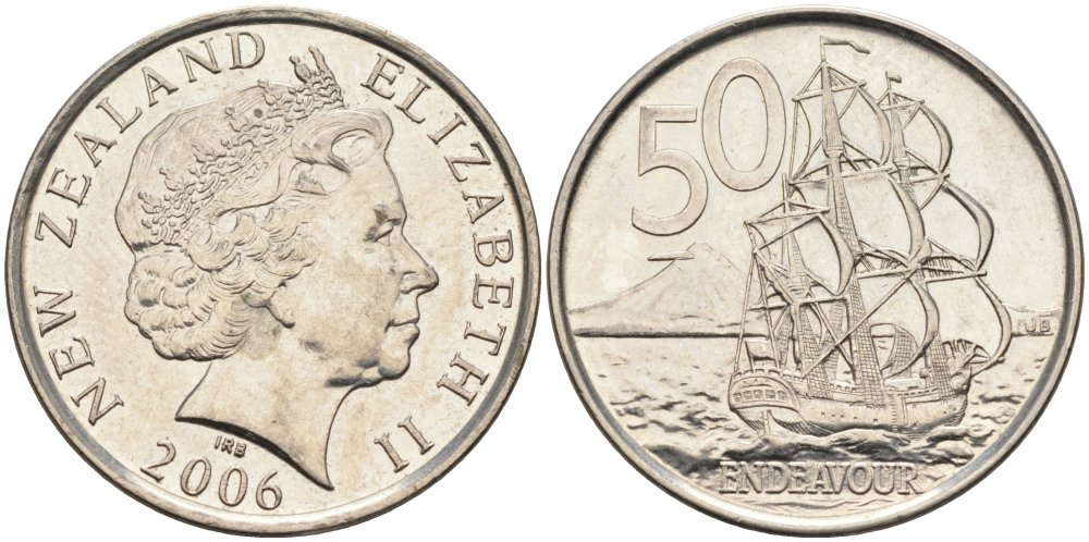 Новая Зеландия 50 центов 2006 Парусник Индевор, Елизавета II (1952-) KM 119а никелированная сталь 4579-1044