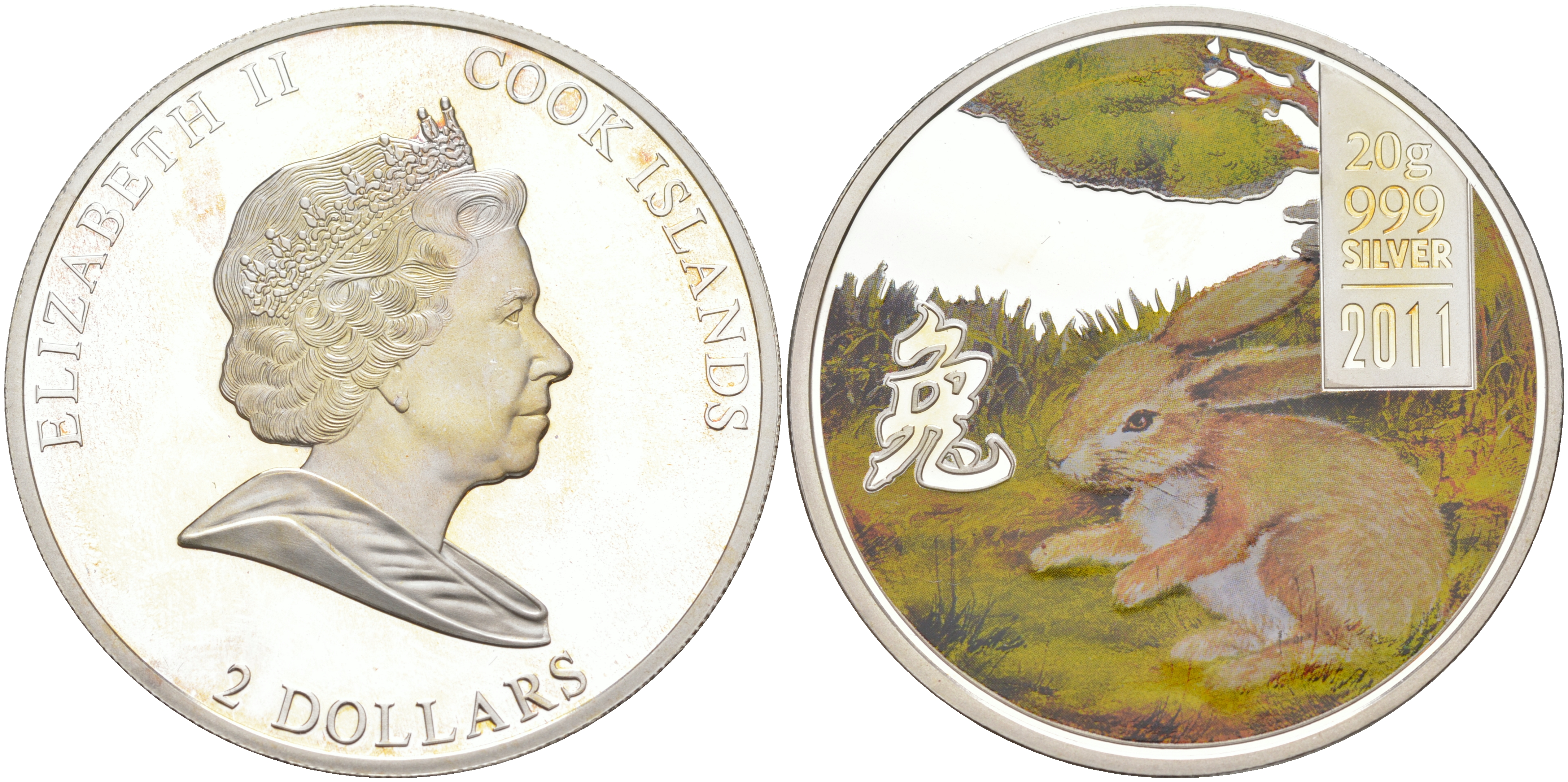 ОСТРОВА КУКА 2 ДОЛЛАРА 2011 ГОД ЗАЙЦА, ЦВЕТНАЯ ЭМАЛЬ, 20 ГР. KM NEW серебро PROOF 1091-9-52