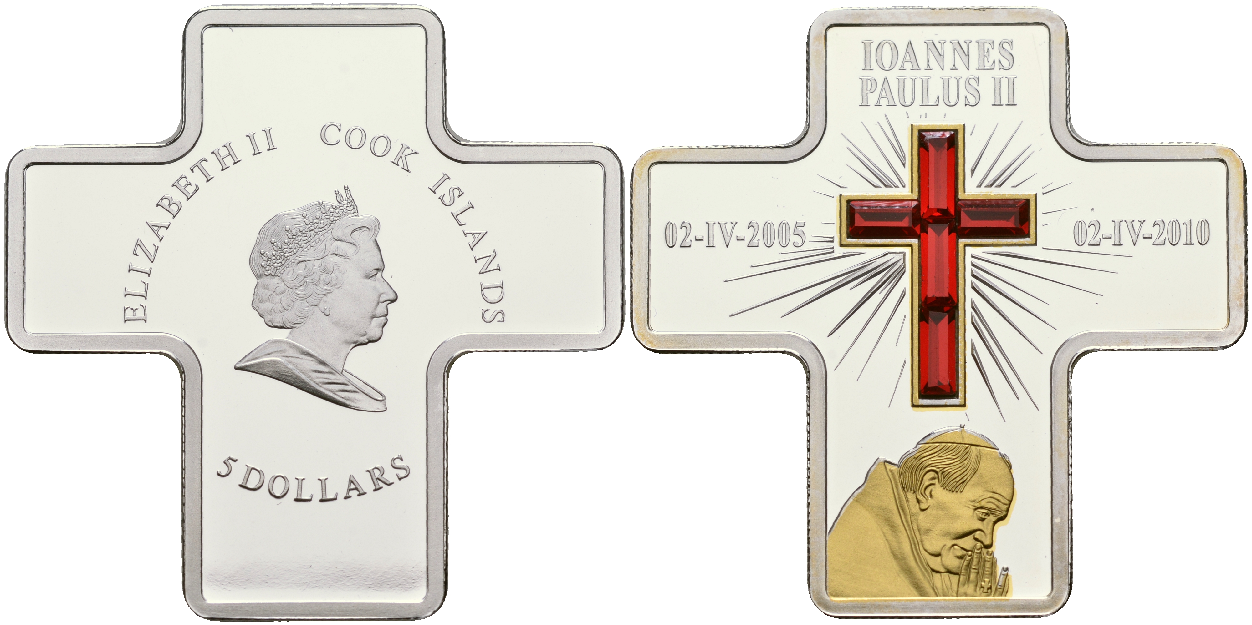 Острова Кука 5 долларов 2010 Иоанн Павел II, молитва, 5 лет со дня смерти, камни, позолота серебро PROOF 1097-4-23
