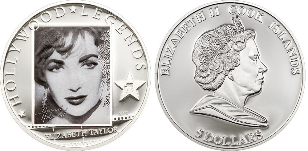 ОСТРОВА КУКА 5 ДОЛЛАРОВ 2011 ЭЛИЗАБЕТ ТЕЙЛОР, цветная эмаль KM NEW серебро PROOF 1074-2-44