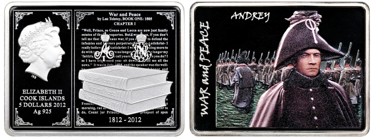 Острова Кука 5 долларов 2012 Лев Толстой, роман "Война и мир", Андрей Болконский, цветная эмаль KM NEW серебро PROOF 1071-10-44