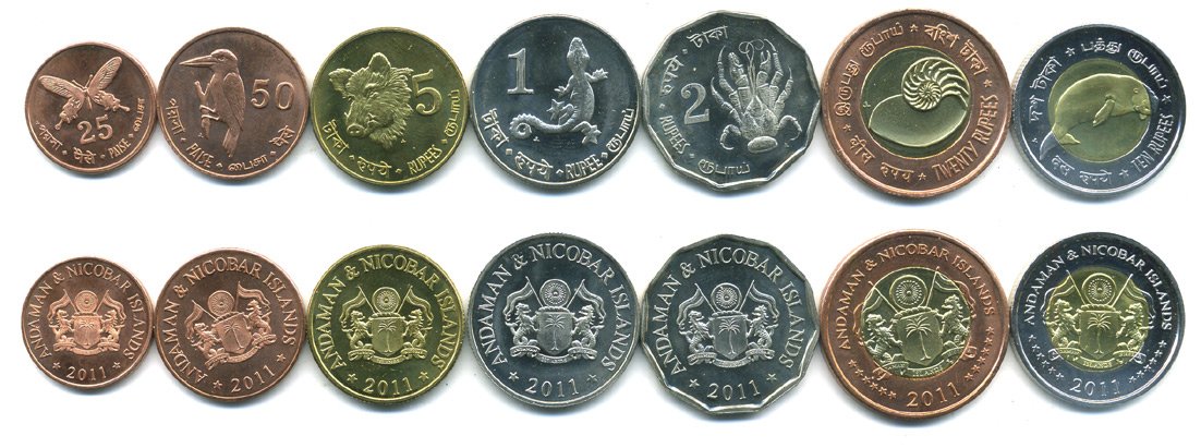 АНДАМАНСКИЕ И НИКОБАРСКИЕ ОСТРОВА ЛОТ ИЗ 7 МОНЕТ 2011 (25, 50 ПАЙСА, 1, 2, 5, 10, 20 РУПИЙ), 2 МОНЕТЫ БИМЕТАЛЛ UNC N4-33
