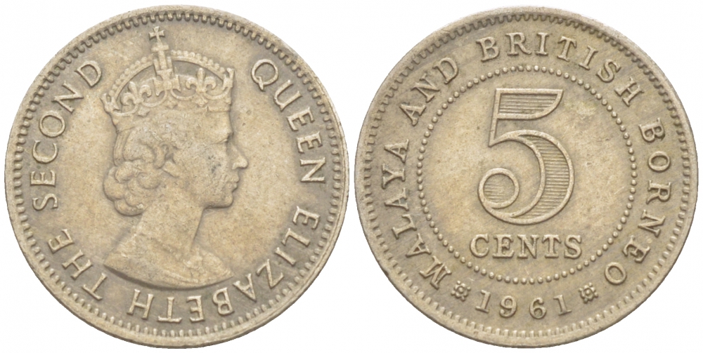МАЛАЙЯ И БРИТАНСКОЕ БОРНЕО 5 ЦЕНТОВ 1961 ЕЛИЗАВЕТА II KM 1 медно-никель 214-858