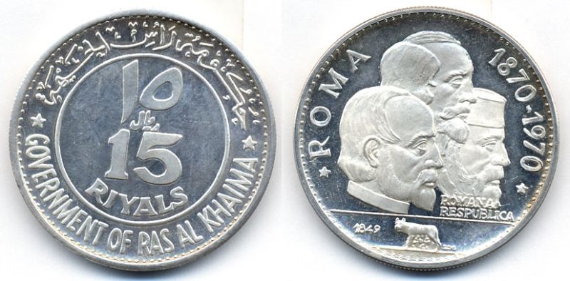 Рас-эль-Хайма 15 риалов 1970 Рим, столетие Римской республики 1870-1970, Сакр бин Мохаммед Аль Касими, тираж 2000 экземпляров KM 18 серебро PROOF 21-001-03
