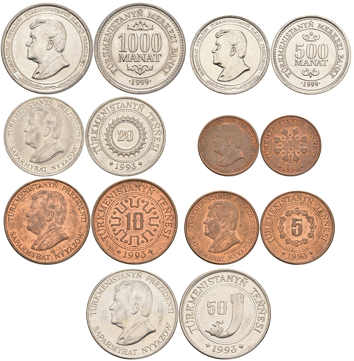 Туркменистан лот из 7 монет 1993-1999 1, 5, 10, 20, 50, 500, 1000 манат KM 1, 2, 3, 4, 5, 12, 13 N3-48