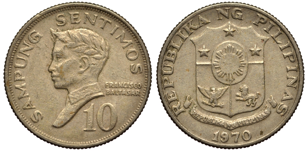 ФИЛИППИНЫ 10 СЕНТИМО 1970 ПОЭТ ФРАНСИСКО БАЛЬТАСАР KM 198 медь цинк никель F 4181-246