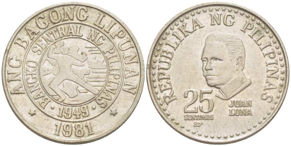 ФИЛИППИНЫ 25 СЕНТИМО 1981 ХУАН ЛУНА KM 227 медно-никель 4513-935