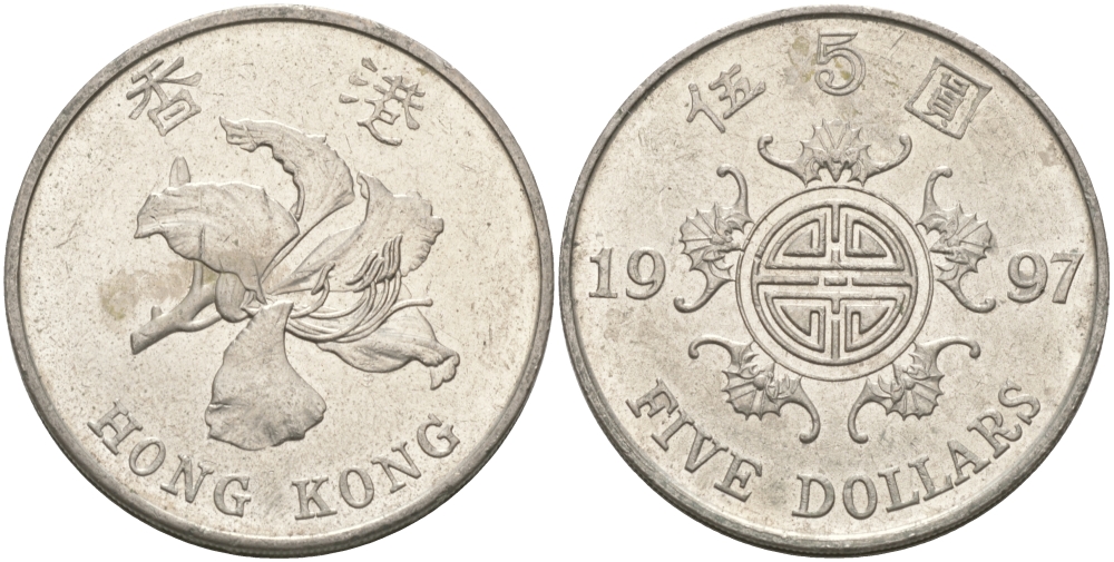 Гонконг 5 долларов 1997 KM 65 медно-никель aUNC 97-514