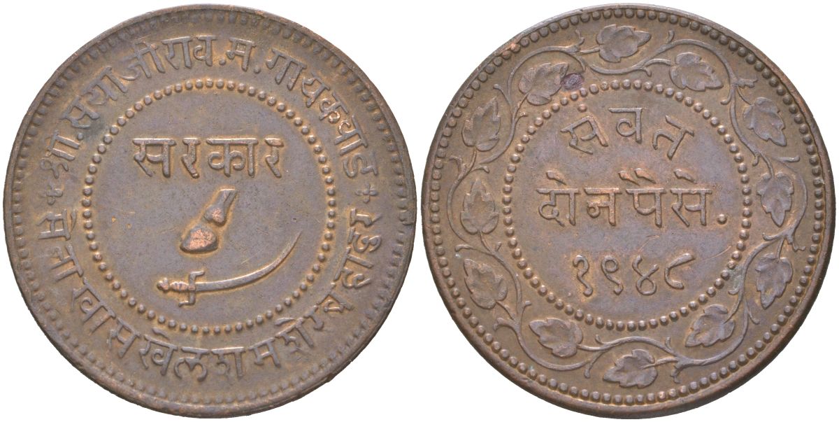 Британская Индия, Барода 2 пайса 1891 VS 1948 туземное княжество, Саяджирао Гаеквад III (1875-1939) Y 32.2a медь 4157-1213