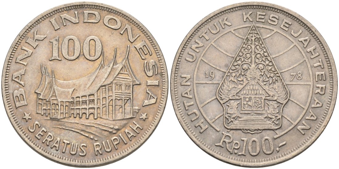 Индонезия 100 рупий 1978 хижина Минангкабау, ДЕРЕВО ЖИЗНИ KM 42 медно-никель 4572-924