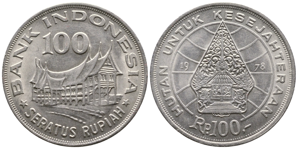 ИНДОНЕЗИЯ 100 РУПИЙ 1978 ХИЖИНА МИНАНГКАБАУ, ЛЕГЕНДАРНОЕ ДЕРЕВО ЖИЗНИ KM 42 медно-никель UNC 177-932