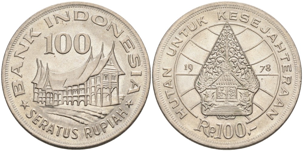 Индонезия 100 рупий 1978 хижина Минангкабау, легендарное Дерево Жизни KM 42 медно-никель UNC 189-843