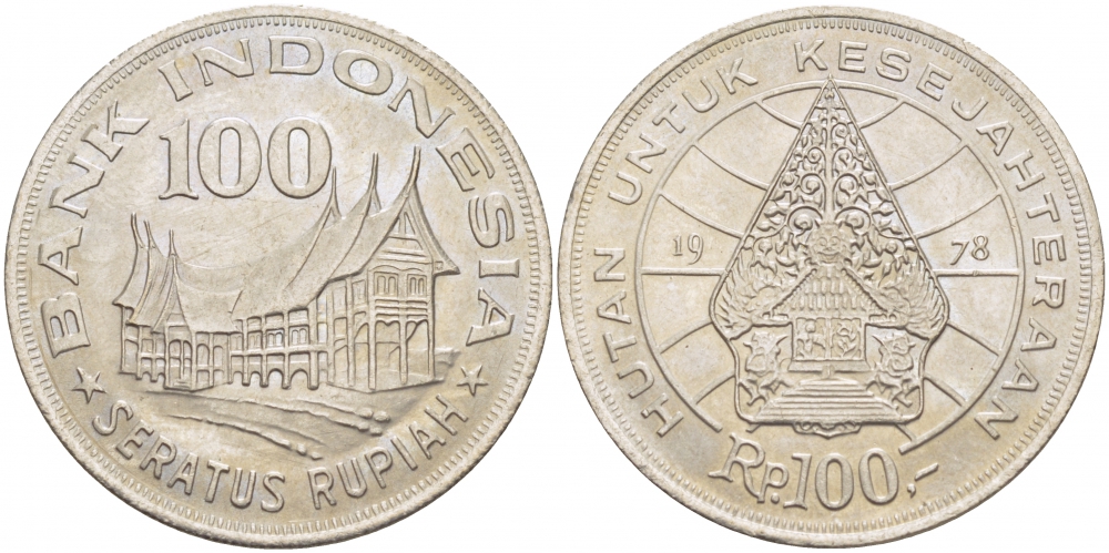 ИНДОНЕЗИЯ 100 РУПИЙ 1978 ХИЖИНА МИНАНГКАБАУ, ЛЕГЕНДАРНОЕ ДЕРЕВО ЖИЗНИ KM 42 медно-никель UNC 3457-134