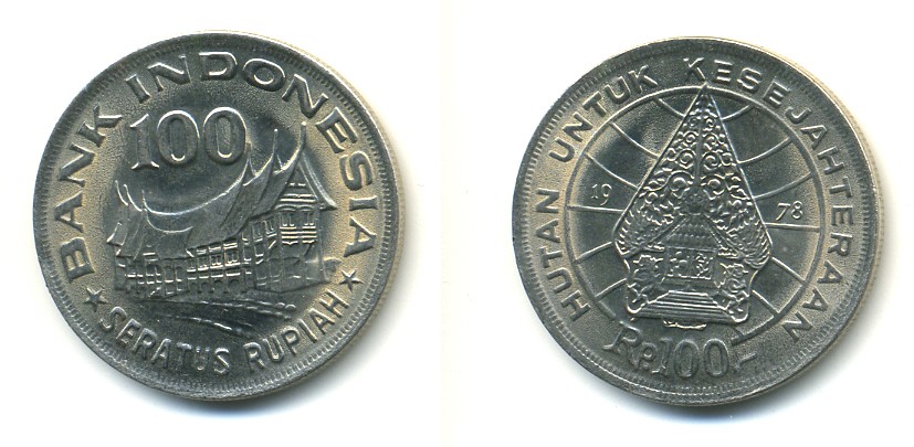 ИНДОНЕЗИЯ 100 РУПИЙ 1978 ХИЖИНА МИНАНГКАБАУ, ЛЕГЕНДАРНОЕ ДЕРЕВО ЖИЗНИ KM 42 медно-никель UNC 4364-744