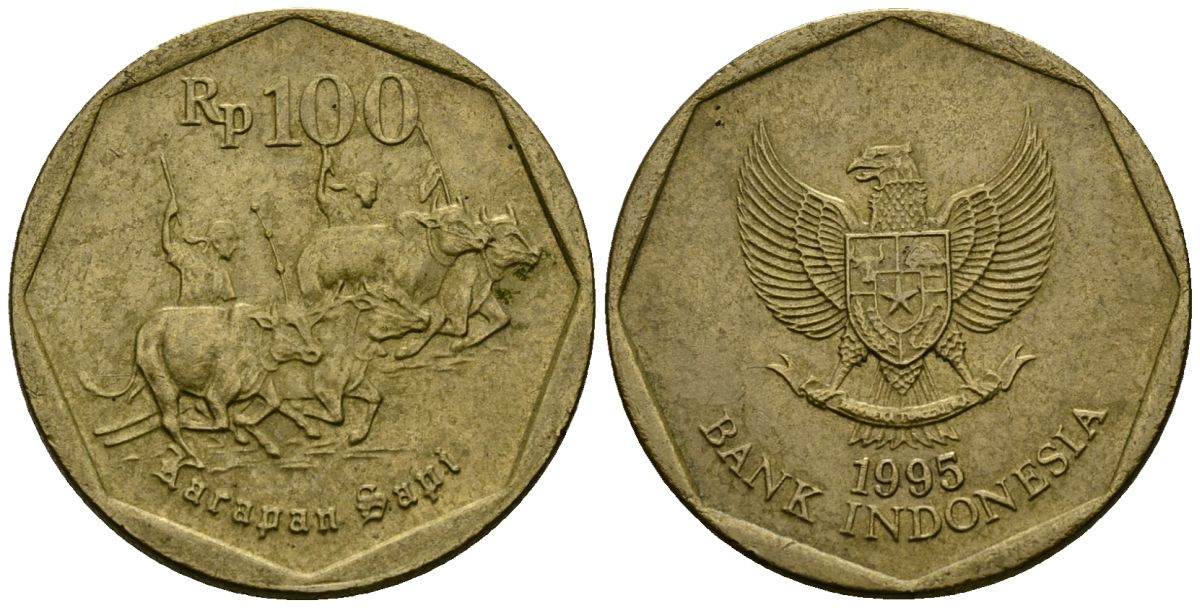 Индонезия 100 рупий 1995 гонки на быках KM 53 алюминиевая бронза 4171-1125