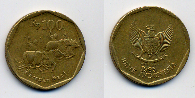 ИНДОНЕЗИЯ 100 РУПИЙ 1995 ГОНКИ НА БЫКАХ KM 53 алюминиевая бронза 54-2254