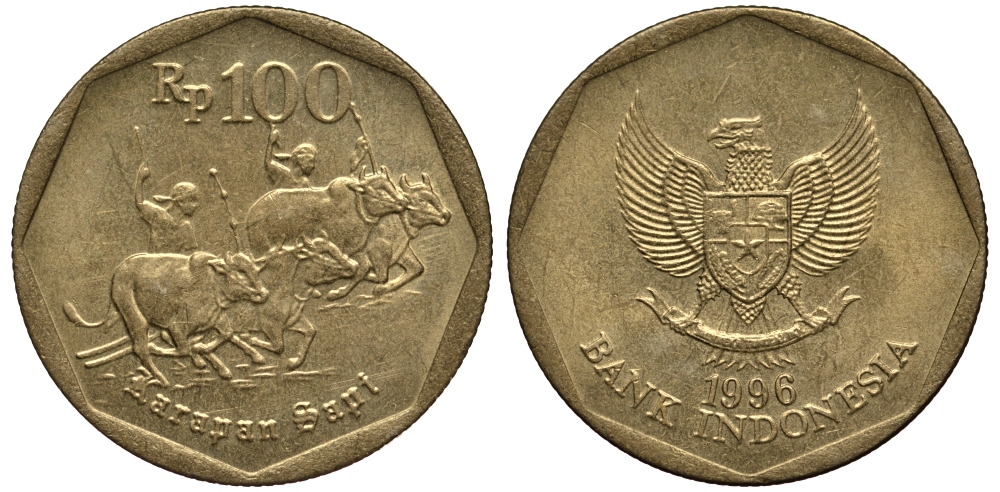 ИНДОНЕЗИЯ 100 РУПИЙ 1996 ГОНКИ НА БЫКАХ KM 53 алюминиевая бронза 4182-321