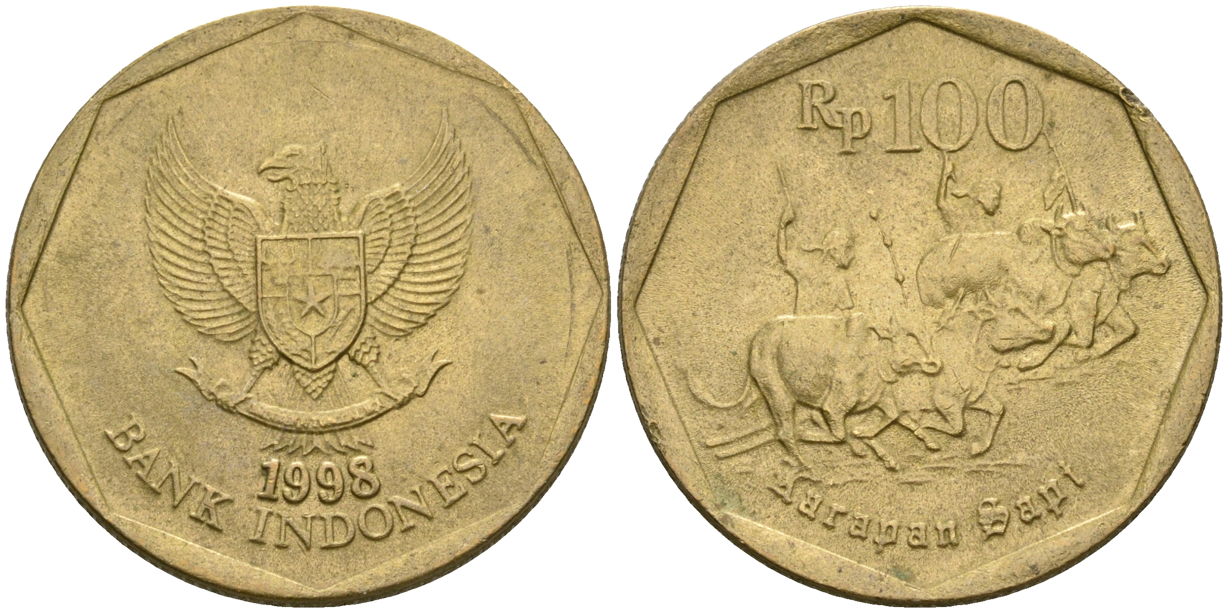 ИНДОНЕЗИЯ 100 РУПИЙ 1998 ГОНКИ НА БЫКАХ KM 53 алюминиевая бронза 4364-2946