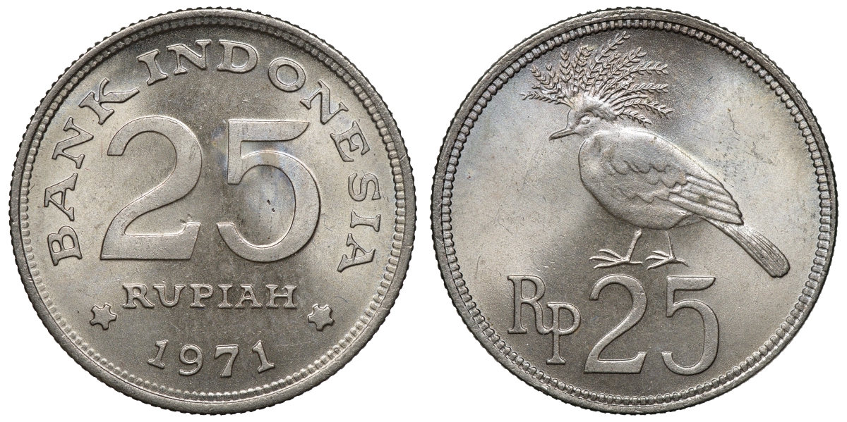 Индонезия 25 рупий 1971 год тип, венценосный голубь KM 34 медно-никель aUNC 4118-142