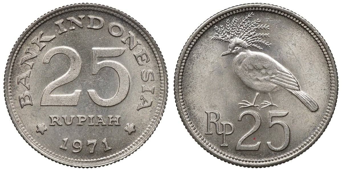 Индонезия 25 рупий 1971 год тип, венценосный голубь KM 34 медно-никель aUNC 4118-144
