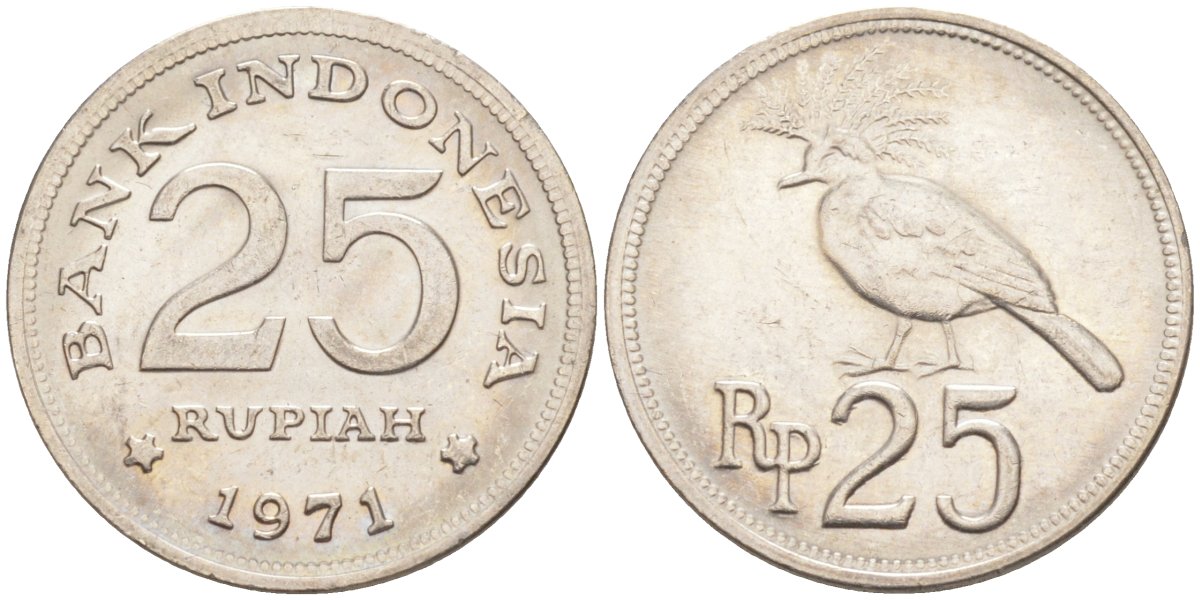 Индонезия 25 рупий 1971 венценосный голубь KM 34 медно-никель 187-415
