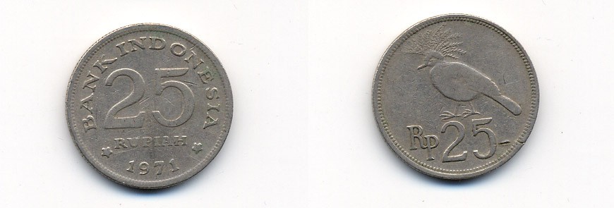 Индонезия 25 рупий 1971 венценосный голубь KM 34 медно-никель 23-1415