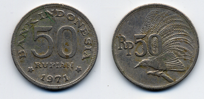 ИНДОНЕЗИЯ 50 РУПИЙ 1971 РАЙСКАЯ ПТИЦА KM 35 медно-никель 54-2032