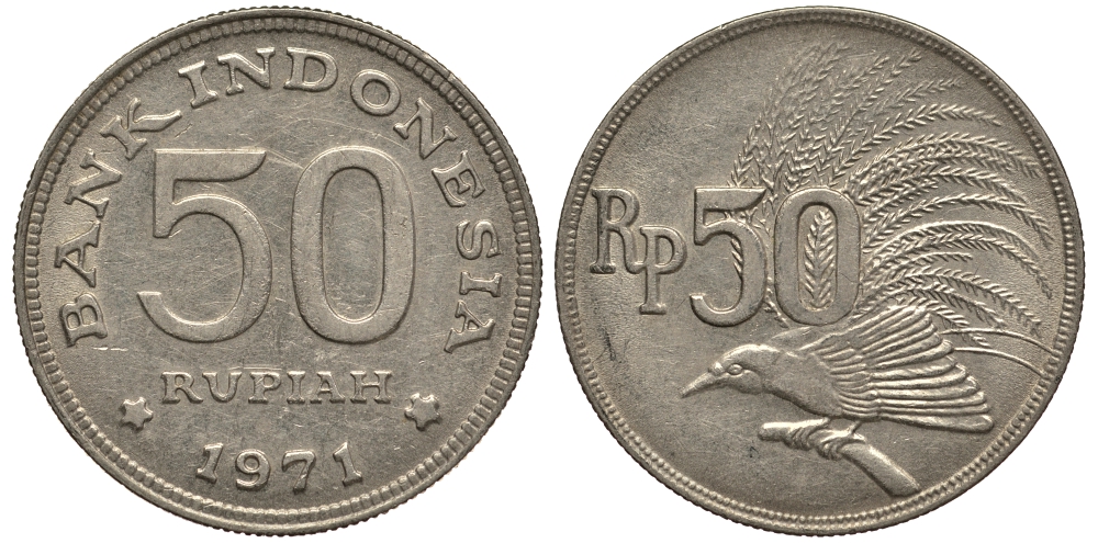ИНДОНЕЗИЯ 50 РУПИЙ 1971 РАЙСКАЯ ПТИЦА KM 35 медно-никель VF 4182-533