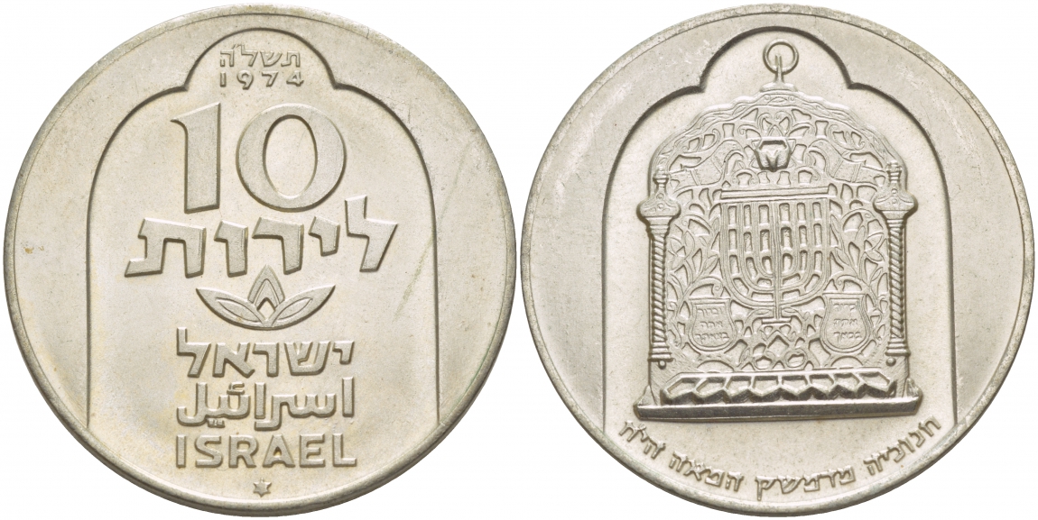 Израиль 10 лир 1974 праздник Ханука, дамасская лампа KM 78.1 серебро UNC 1091-1-13