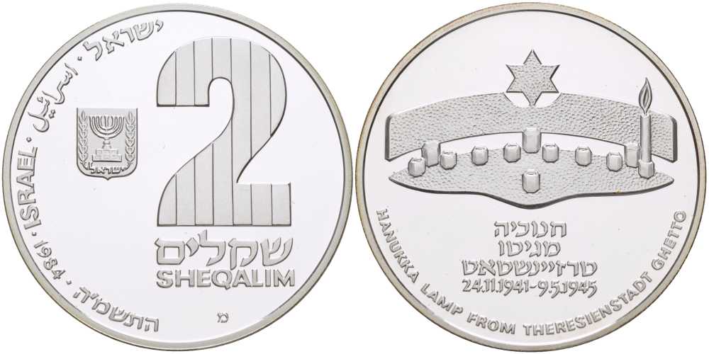 Израиль 2 шекеля 1984 праздник Ханука, Терезинская лампа, тираж 10011 экземпляров KM 145 серебро PROOF 1080-10-13