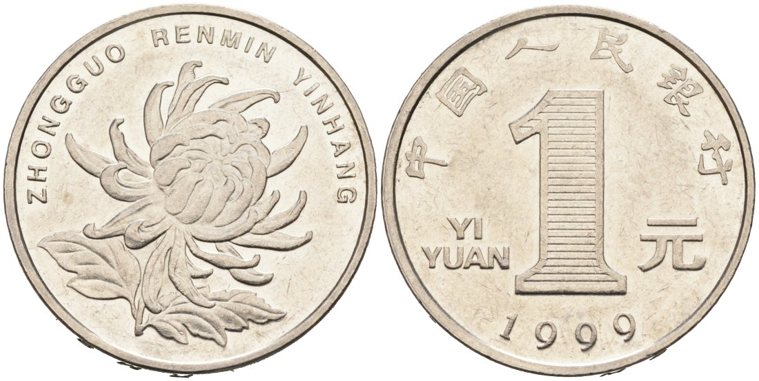Китай 1 юань 1999 KM 1212 никелированная сталь 27-311