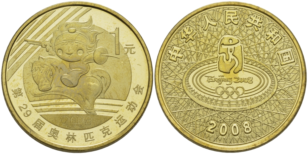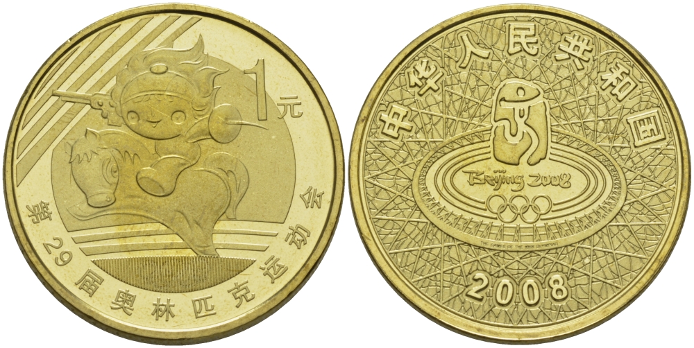 КИТАЙ 1 ЮАНЬ 2008 XXIX ОЛИМПИЙСКИЕ ИГРЫ В ПЕКИНЕ, СИМВОЛИКА, КОННЫЙ СПОРТ KM 1812 латунь PROOF 1072-10-32