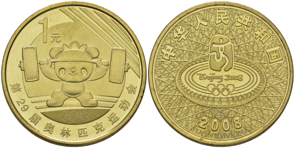 КИТАЙ 1 ЮАНЬ 2008 XXIX ОЛИМПИЙСКИЕ ИГРЫ В ПЕКИНЕ, СИМВОЛИКА, ШТАНГА KM 1776 латунь PROOF 1072-10-15